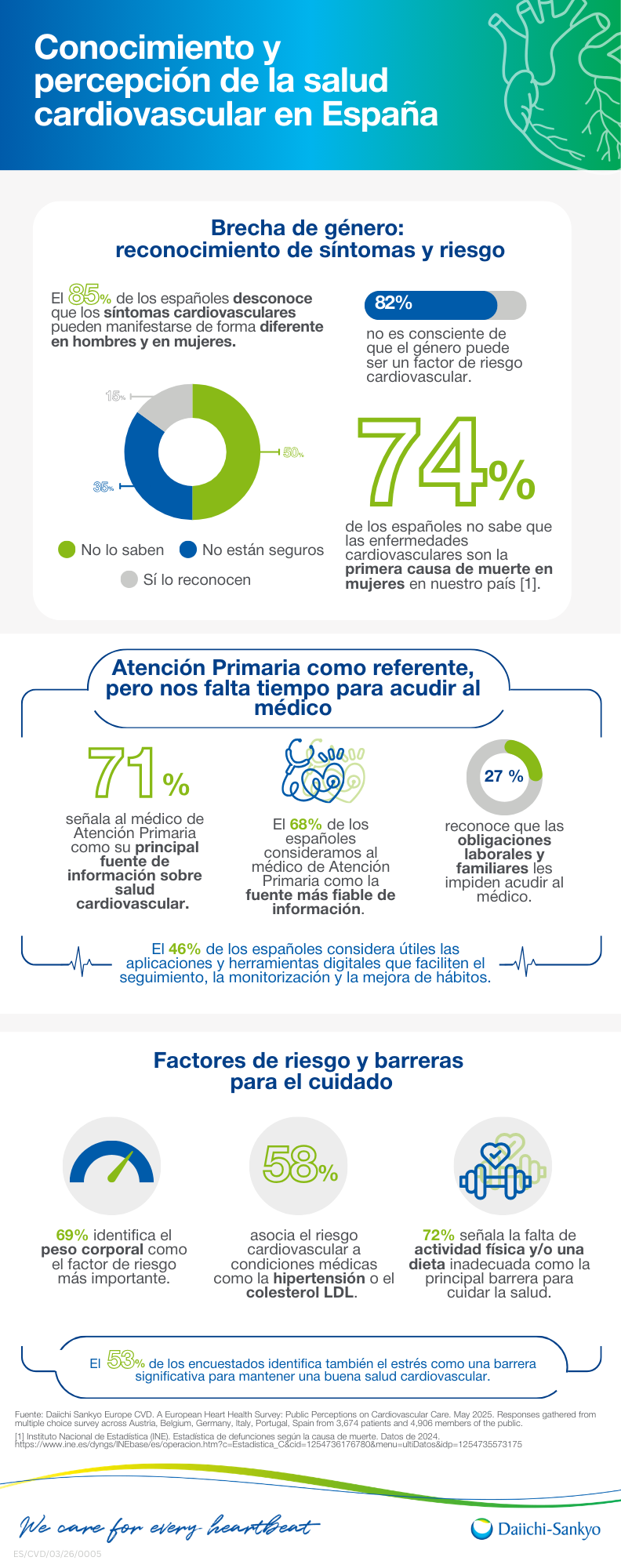 En cuanto a los factores de riesgo, el 69% identifica el peso corporal como el más relevante, mientras que el 58% asocia el riesgo cardiovascular a condiciones como la hipertensión o el colesterol LDL. Como barreras para el cuidado, el 72% señala la falta de actividad física y una dieta inadecuada, y el 53% añade el estrés como obstáculo significativo para mantener una buena salud cardiovascular.